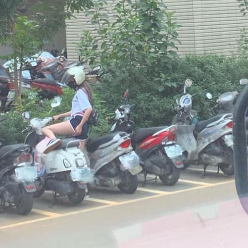 職業聯結車 大貨車 大客車 拉拉隊 運輸業 照片影片資訊分享團」PO出養眼照,他歪樓直呼「小弟不才,不知道凸鏡跟後照鏡這個角度可以嗎?」照片中,有1個凸鏡與2個後照鏡,左側最讓人眼睛為之一亮,一名長髮辣妹正準備下機車,就怕真理褲太短會走光,只好趕緊拉好褲沿。
